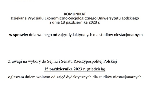 Dziekan Wydziału Ekonomiczno-Socjologicznego wydał komunikat w sprawie dnia wolnego od zajęć dydaktycznych.