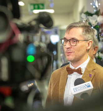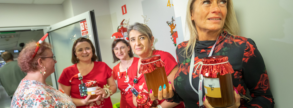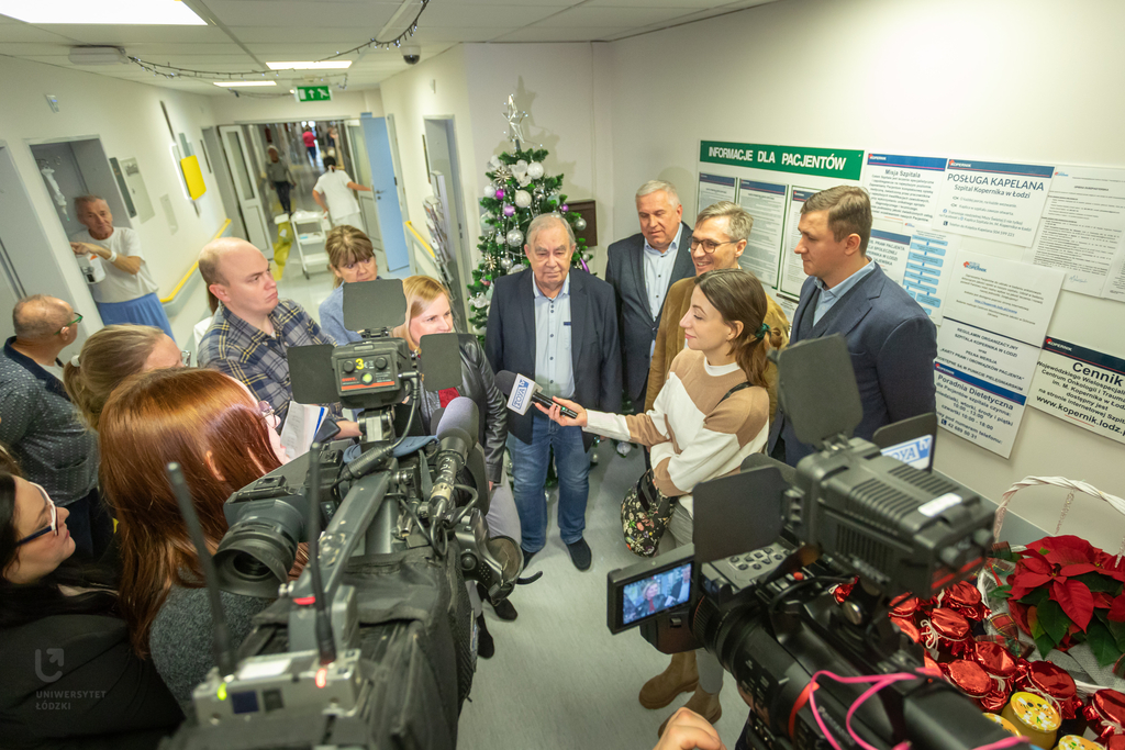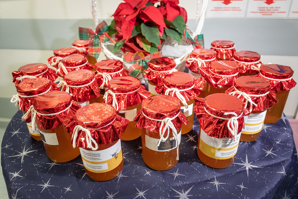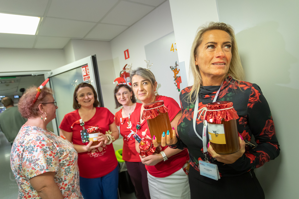 Do darowizny dołączyli także ze swoimi miodami członkowie Stowarzyszenia Pszczelarzy Ziemi Łódzkiej, z którymi od lat współpracuje Uniwersytet Łódzki. Uroczyste przekazanie daru pacjentom odbyło się wczoraj, w mikołajki, na świątecznie udekorowanym oddziale szpitala im. Kopernika. Wzięli w nim udział m.in. dr Maja Lisik-Habib, kierownik Oddziału Chorób Rozrostowych, Andrzej Kasprzyk, dyrektor Szpitala im. Kopernika, Dorota Bartnik, zastępczyni dyrektora Biblioteki Uniwersytetu Łódzkiego, dr hab. Mariusz Sokołowicz, prof. UŁ, dziekan Wydziału Ekonomiczno-Socjologicznego UŁ, Artem Luhovyi, opiekun pasieki na EkSocu UŁ oraz członek Stowarzyszenia Pszczelarzy Ziemi Łódzkiej, a także Andrzej Kołuda, prezes Stowarzyszenia Pszczelarzy Ziemi Łódzkiej.