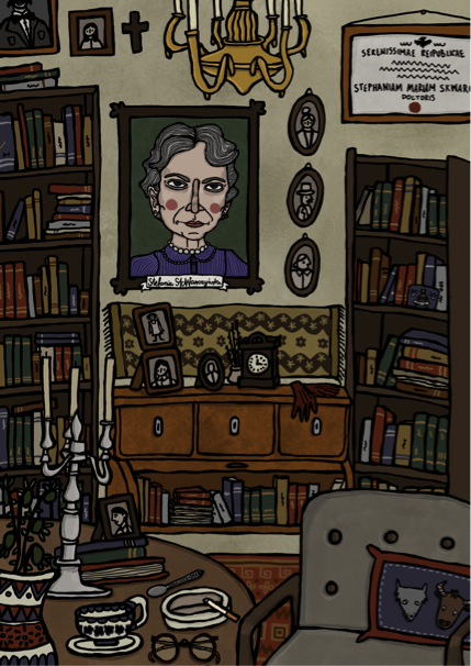 Grafiki z przedmiotami odsyłającymi do poszczególnych historii można odnaleźć również na dużym plakacie promującym uroczystość. Obraz stanowi artystyczną wizję pokoju prof. Skwarczyńskiej. Zostały w nim uwzględnione symboliczne przedmioty odzwierciedlające codzienne zachowania oraz charakter polskiej teoretyczki.