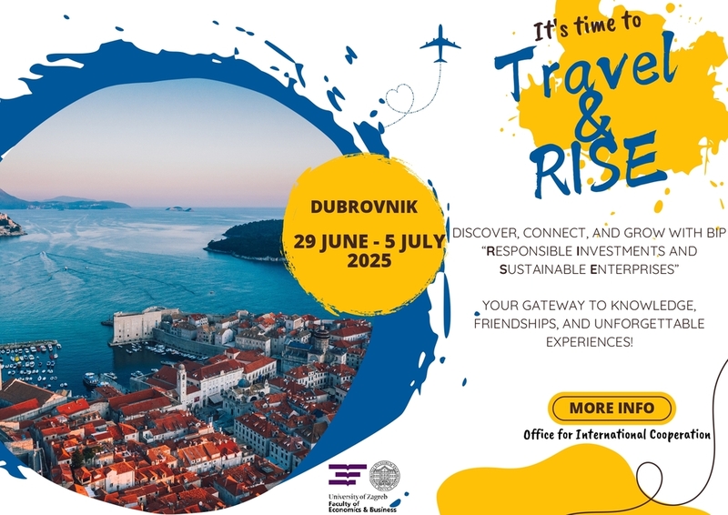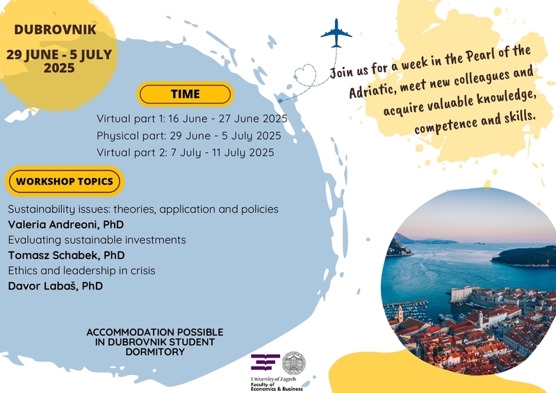 Program zakłada komponent wirtualny (online) realizowany w dniach 16 - 27 czerwca 2025 r. i 7-11 lipca 2025 r. oraz mobilność fizyczną (29 czerwca - 5 lipca 2025), tzn. wyjazd do Dubrovnika, gdzie będą odbywały się zajęcia stacjonarne, podejmujące temat „RESPONSIBLE INVESTMENTS ANDSUSTAINABLE ENTERPRISES”: