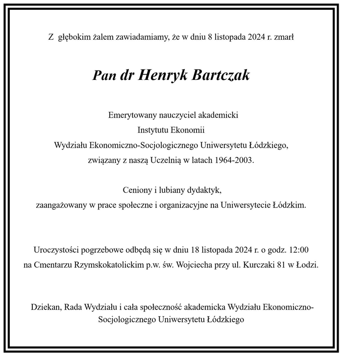 Wyrazy szczerego współczucia Rodzinie, składają Władze i Pracownicy Wydziału Ekonomiczno-Socjologicznego UŁ.