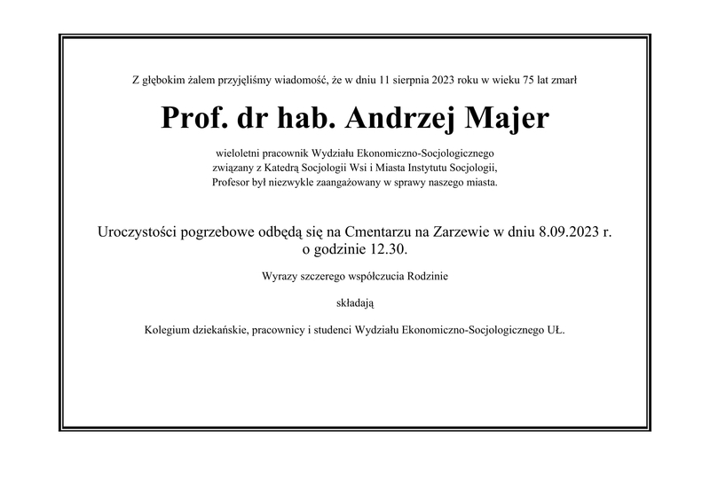 W dniu 11 sierpnia 2023 w wieku 75 lat zmarł prof. dr hab. Andrzej Majer, wieloletni pracownik Wydziału Ekonomiczno-Socjologicznego UŁ związany z Katedrą Socjologii Wsi i Miasta Instytutu Socjologii. Profesor był niezwykle zaangażowany w sprawy naszego miasta.