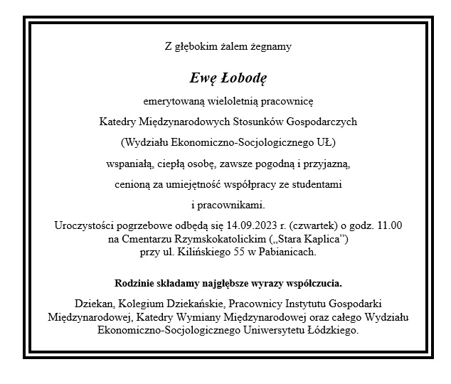 W dniu 9 września 2023 r. w wieku 69 lat zmarła Ewa Łoboda, wieloletnia pracownica Wydziału Ekonomiczno-Socjologicznego UŁ związana z Katedrą Międzynarodowych Stosunków Gospodarczych.