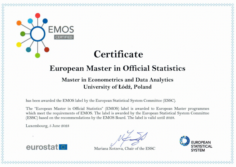 Od roku akademickiego 2023/2024 studia magisterskie na kierunku Ekonometria i analityka danych (EKAD) umożliwiają studentom uzyskanie międzynarodowego certyfikatu European Master in Official Statistics (EMOS) nadawanego przez Komitet Europejskiego Systemu Statystycznego (European Statistical System Committee, ESSC) oraz Europejski Urząd Statystyczny (European Statistical Office, Eurostat).