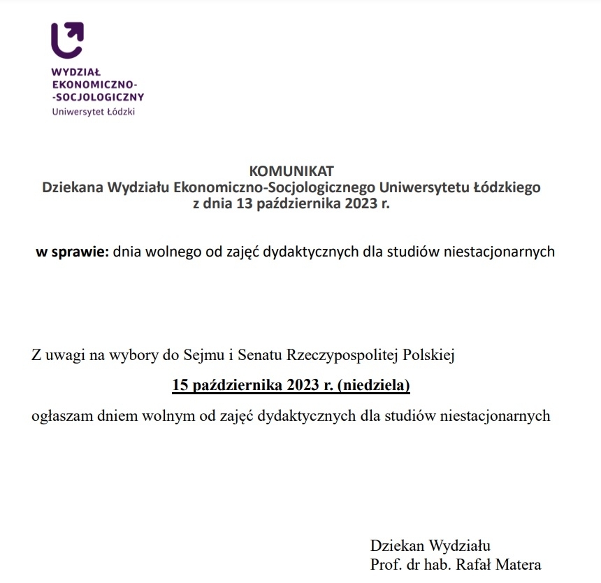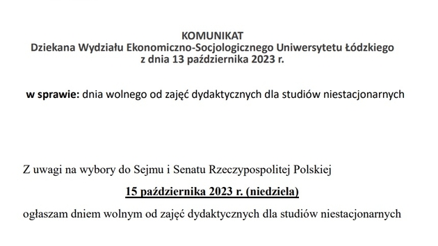 Z uwagi na wybory do Sejmu i Senatu Dziekan Wydziału Ekonomiczno-Socjologicznego ogłosił niedzielę 15 października dniem wolnym od zajęć dydaktycznych.