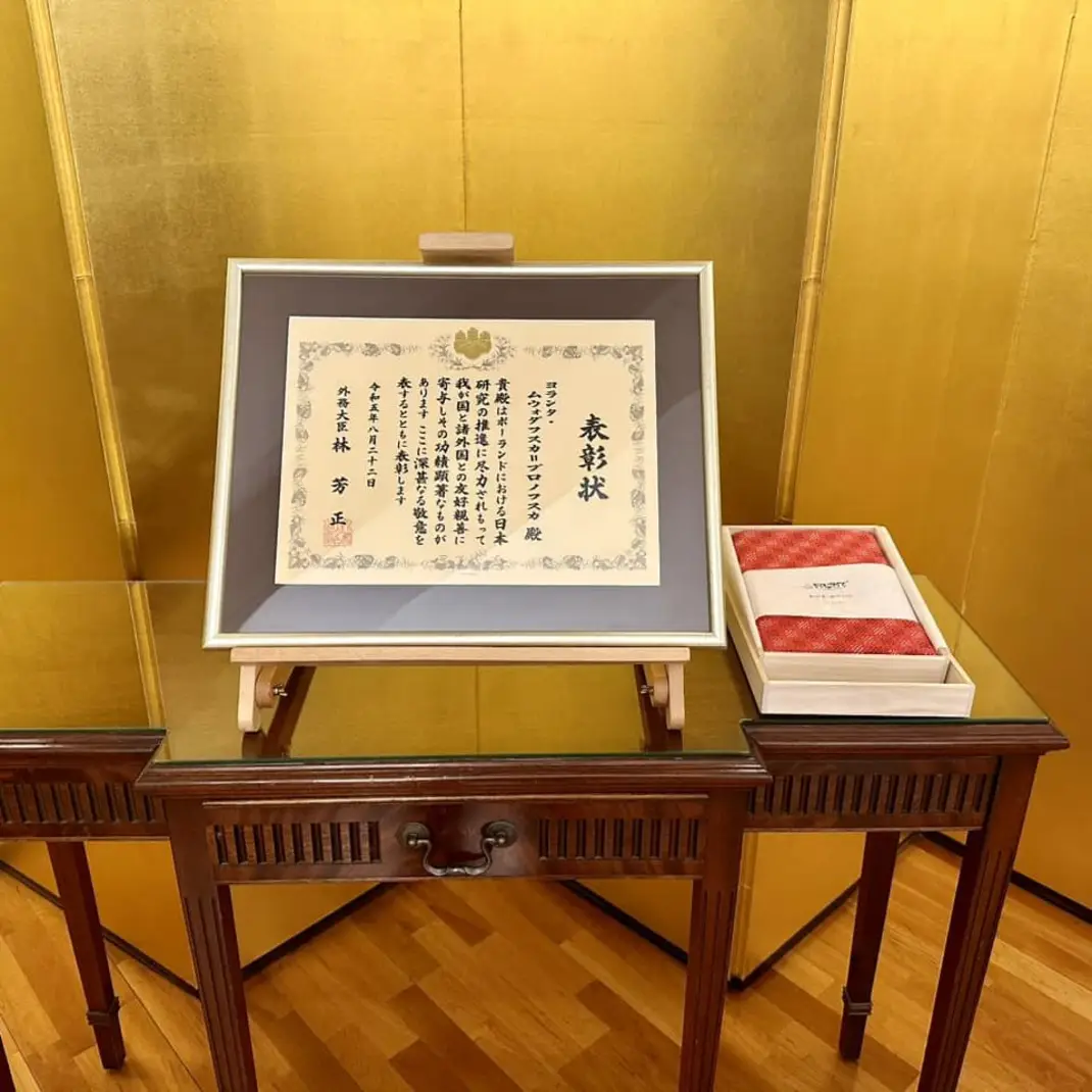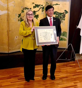 Dyplom Ministra Spraw Zagranicznych Japonii, Yoshimasy Hayashi, wręczył prof. Młodawskiej-Bronowskiej osobiście Jego Ekscelencja Ambasador Nadzwyczajny i Pełnomocny Japonii w Polsce, Pan Akio Miyajima.