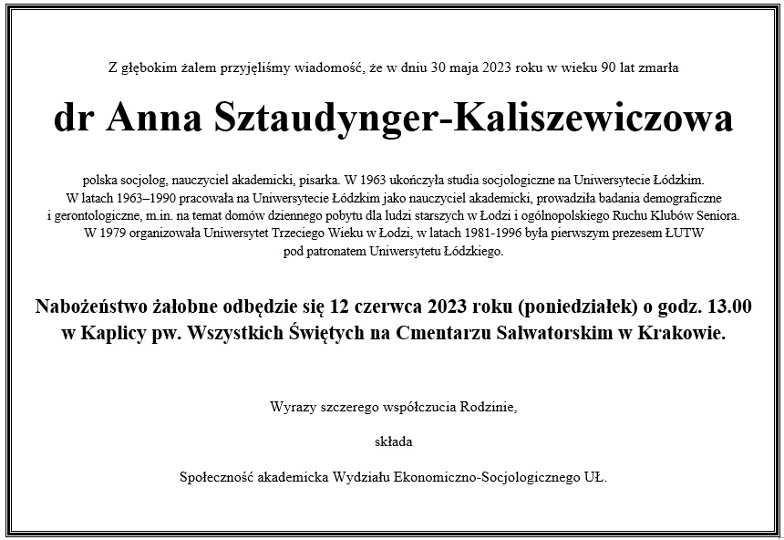 Doktor Anna Sztaudynger-Kaliszewiczowa była polską socjolog, nauczycielką akademicką, pisarką. W 1963 ukończyła studia socjologiczne na Uniwersytecie Łódzkim. W latach 1963–1990 pracowała na Uniwersytecie Łódzkim jako nauczyciel akademicki, prowadziła badania demograficzne i gerontologiczne, m.in. na temat domów dziennego pobytu dla ludzi starszych w Łodzi i ogólnopolskiego Ruchu Klubów Seniora. W 1979 organizowała Uniwersytet Trzeciego Wieku w Łodzi, w latach 1981-1996 była pierwszym prezesem ŁUTW pod patronatem Uniwersytetu Łódzkiego.